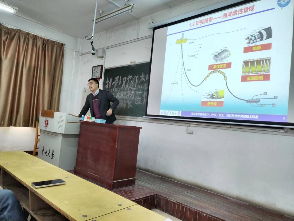 报告中,杨志勋教授以“海洋柔性管缆设计分析、加工、测试、运维关键技术进展”为主题,首先传达了"力学很重要的"思想,接着对海洋柔性管缆的运用做了简单的陈述,分别介绍了海洋柔性管缆的设计分析技术研究、加工力学行为研究、测试技术研究、运维技术研究。对其所在科研团队围绕脐带缆截面布局多学科优化设计、柔性管/缆线型优化设计方法、高性能防弯器结构优化设计、脐带缆双尺度协同优化设计策略等研究方向做了重点介绍。在随后的交流环节中,杨志勋校友对现场师生的提问进行了一一解答。