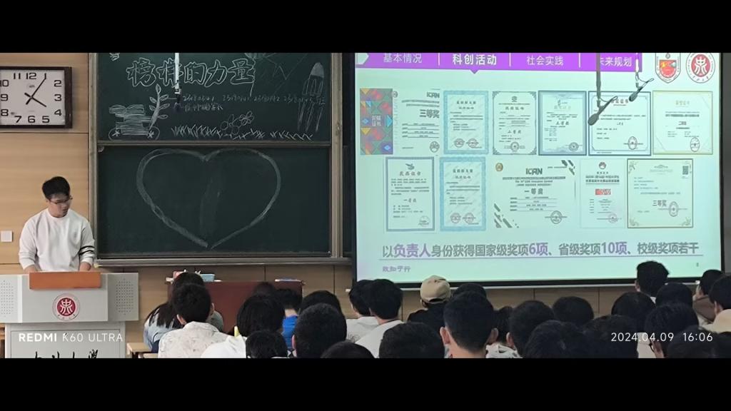 2024年4月9日,23180141、23180142、23180143、23180341四个班级邀请到第十三届校长奖章获得者、推免至清华大学精密仪器系的侯帅鹏学长,在09201H教室召开了“榜样的力量”主题班会,班主任段老师和190余名同学共同聆听了精彩的分享。