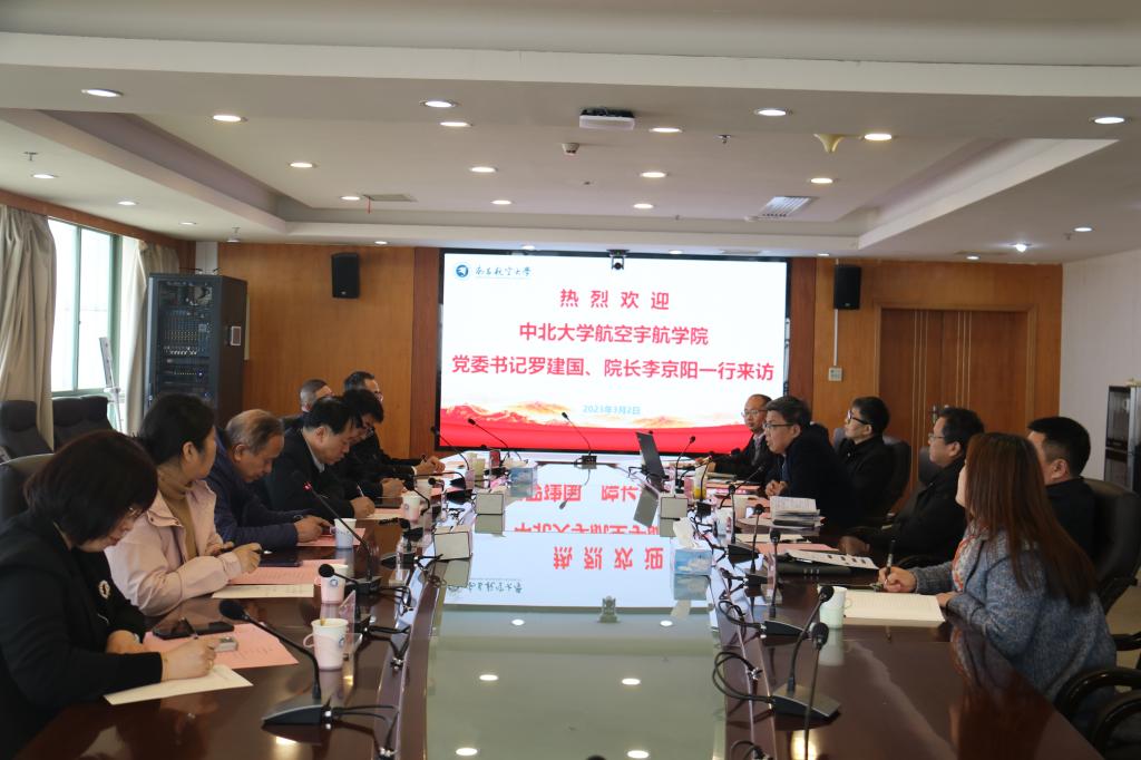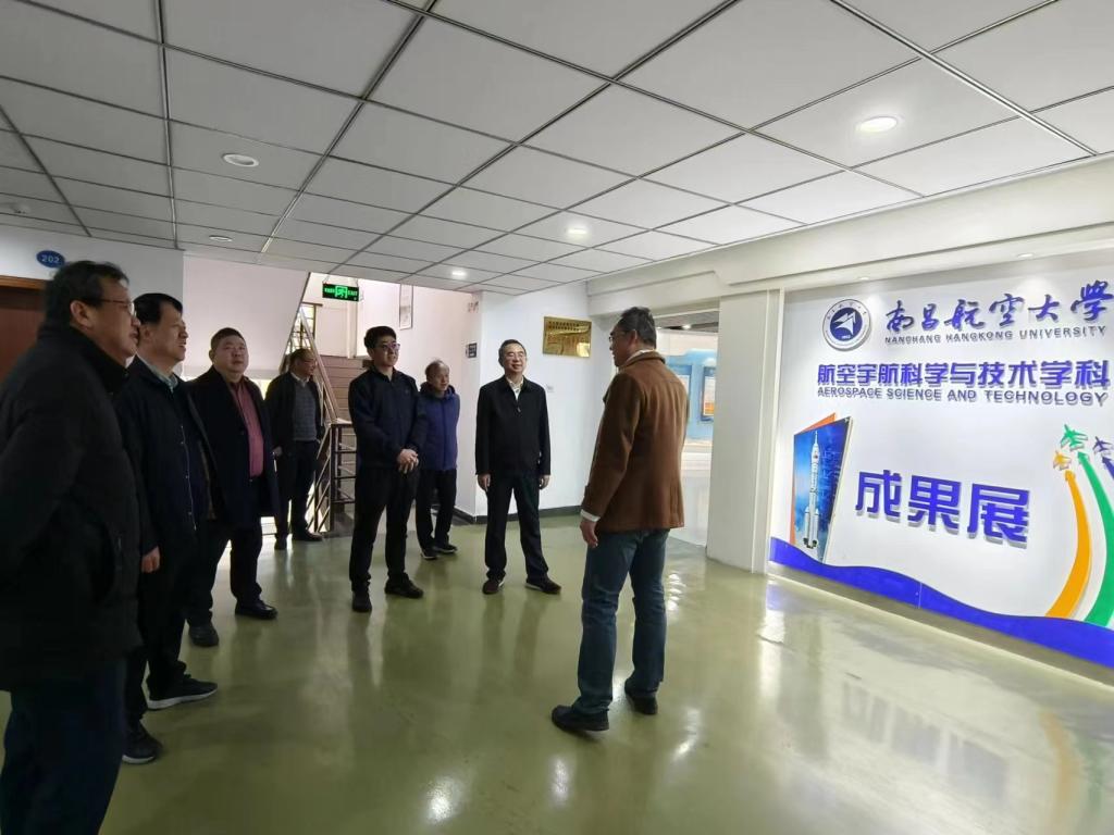 3月2日上午大发彩票平台 党委书记罗建国、院长李京阳带队一行7人到南昌航空大学考察调研,在南昌航空大学航空宇航学部常务副部长卢百平的陪同下,大发彩票平台 一行老师参观了微小发动机实验室、S栋室内机库、增材制造中心、航空宇航科学与技术成果展厅以及航空构件先进介质成型技术实验室。