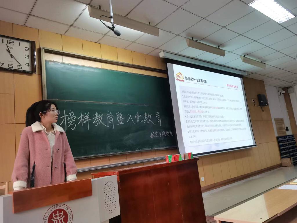 2022年10月23日上午十点,大发彩票平台在11108教室召开2022级榜样教育暨入党启蒙大会,22级航天类专业班主任段雪倩出席会议,19级吕倩,侯贝然,鲍芃荣作为榜样分享了他们的学习考研经验,全体新生参与本次大会。