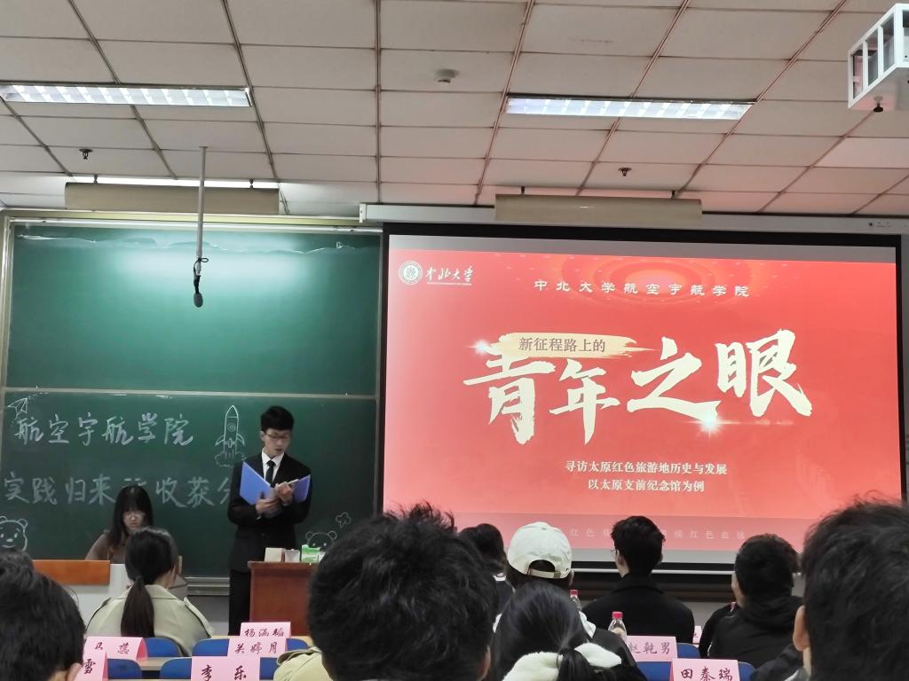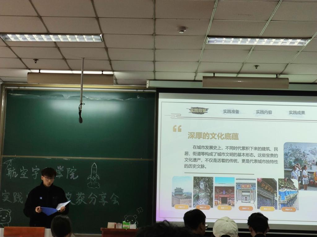 校重点组队,并依托实践成果参与挑战杯红色专项赛道,荣获山西省一等奖,入围全国赛事。他向同学们分享了社会实践的感悟与成功经验。21级飞行器设计与工程专业的石君琇同学以个人形式参与了2023年暑期社会实践,他以个人视角分享了在实践中学真知、悟真谛,炼品格,长才干的感悟。