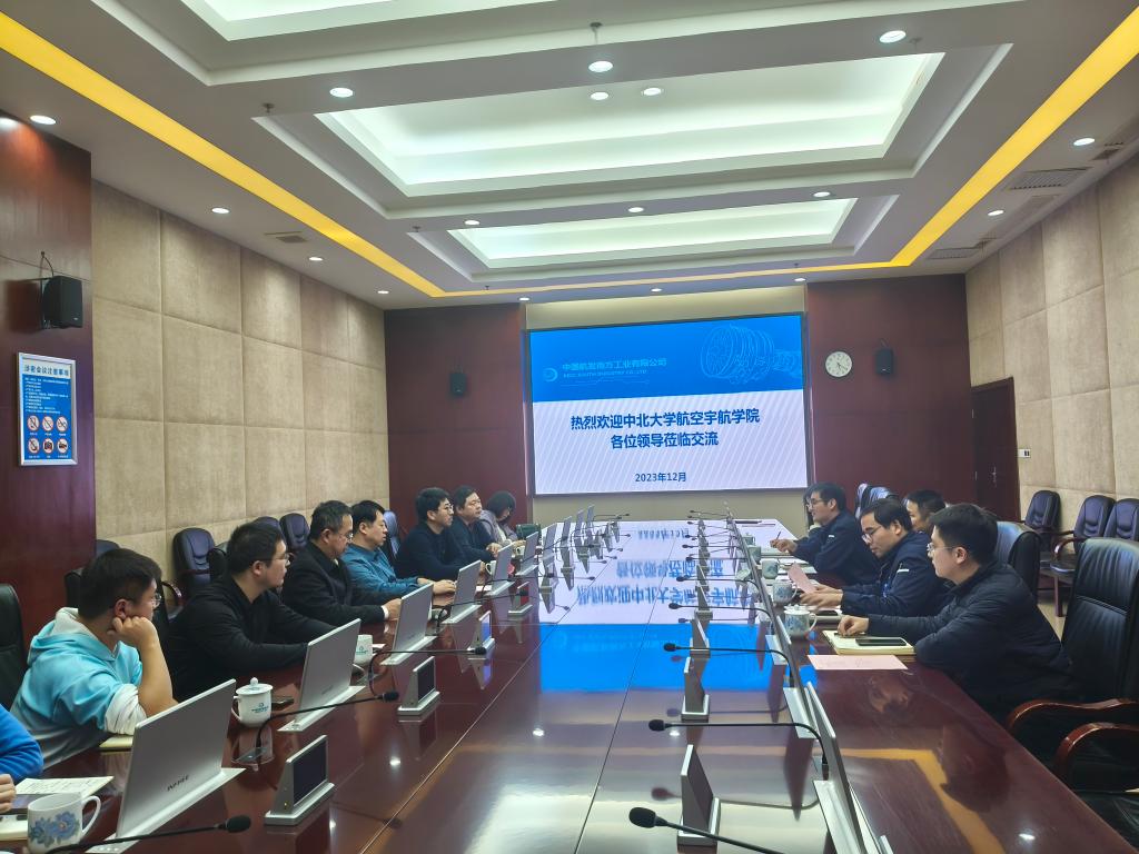 一行的到来表示热烈地欢迎。通过观看中国南方航空工业集团的宣传片,深入了解集团近几年的发展情况。李京阳院长就学生实习实践、学生就业去向、科研项目申报等进行了深度交流和沟通,郝文军部长高度认可我校毕业生在企业的表现,并欢迎优秀毕业生集团入职,赵强部长希望校企发挥各自的优势,切实加强联系,促进在人才培养、项目协同、技术攻关等多方面的深度交流合作。